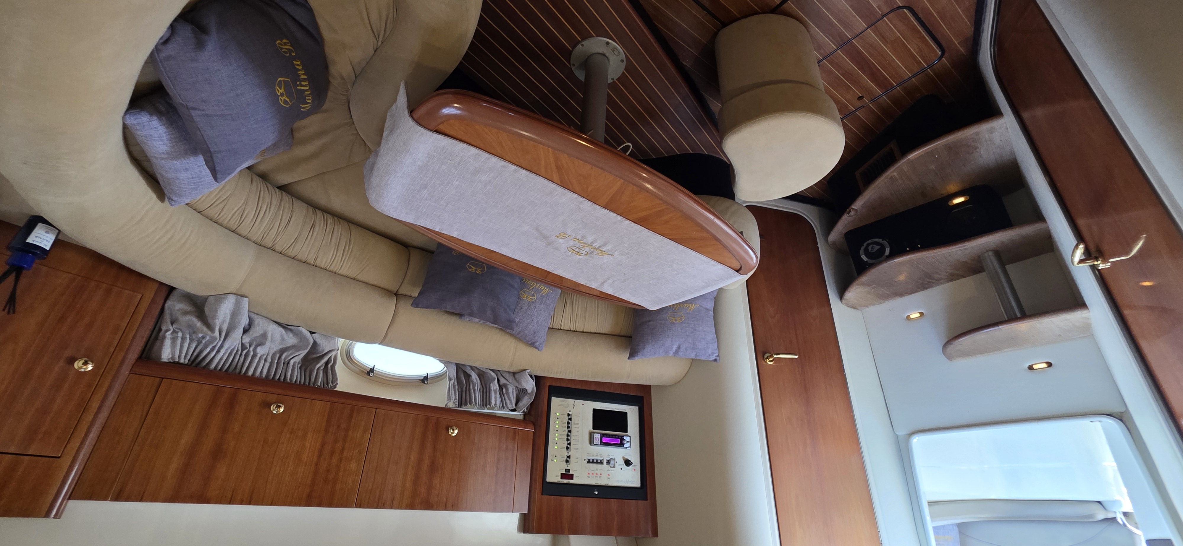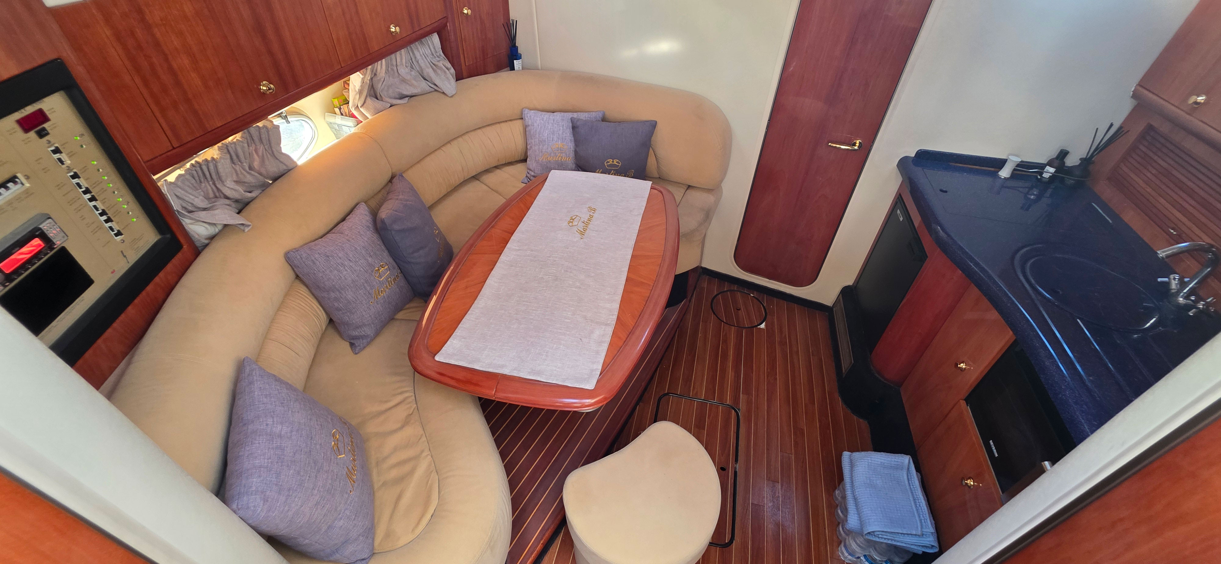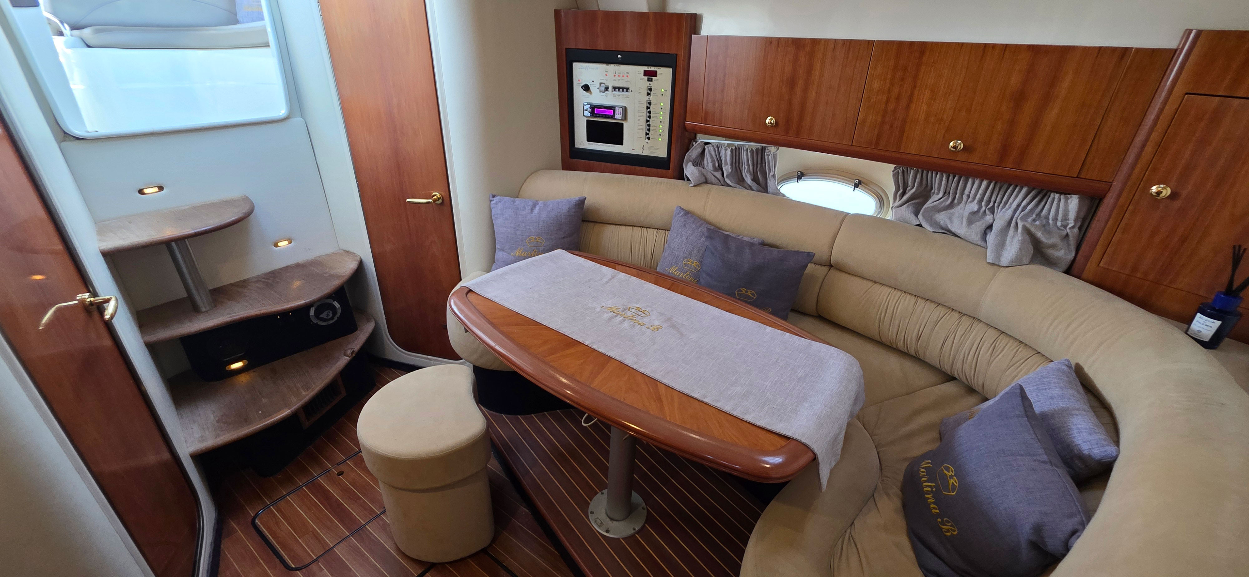 The interior is finished with mahogany flooring and elegant upholstery (recently refurbished), creating a warm and inviting atmosphere. The saloon features a C-shaped dinette with a solid wood table.
