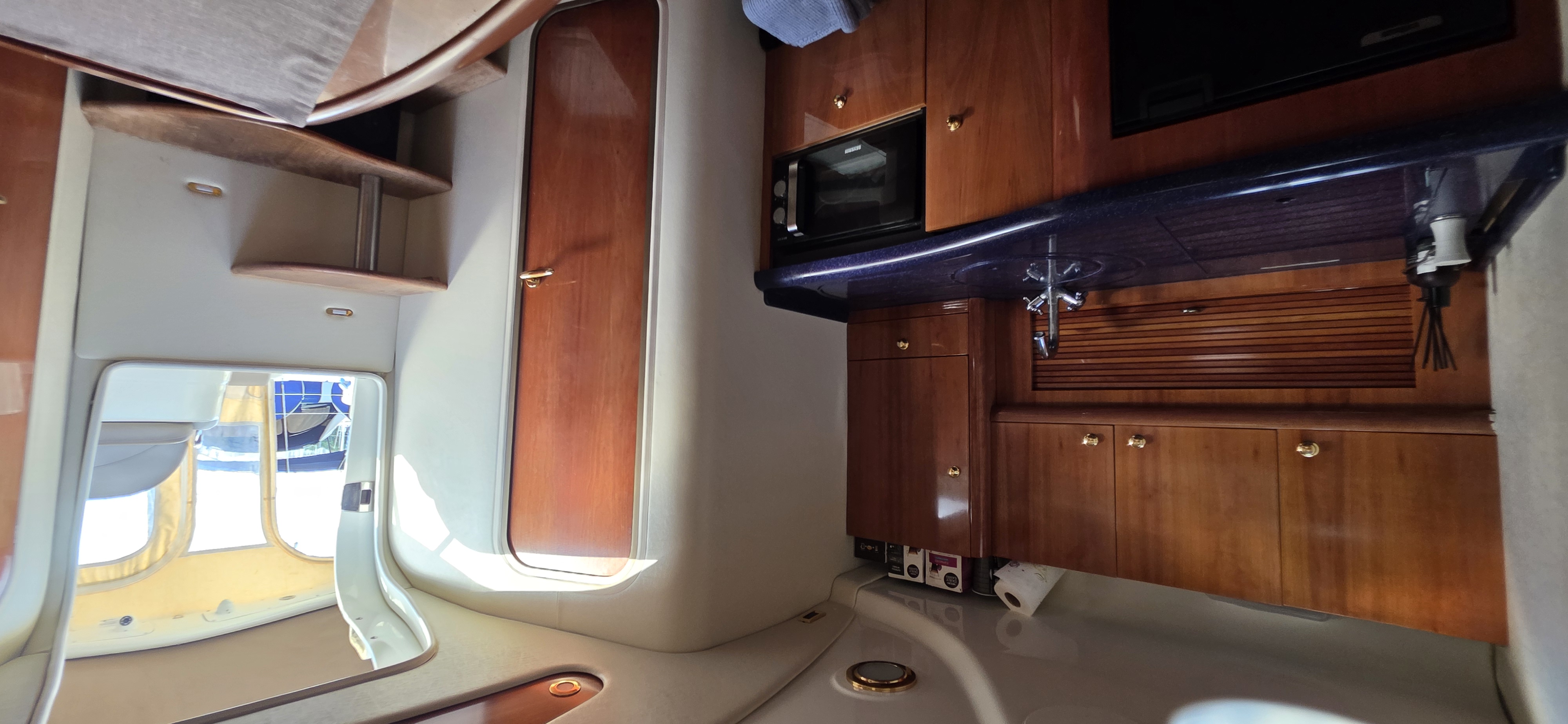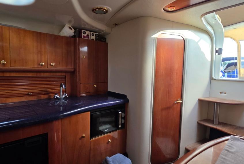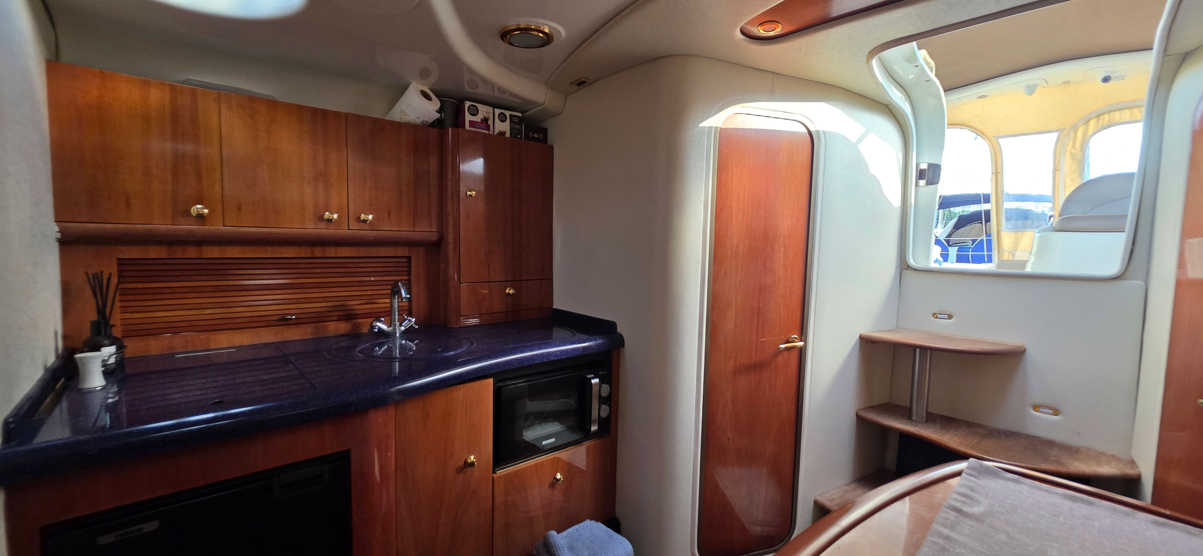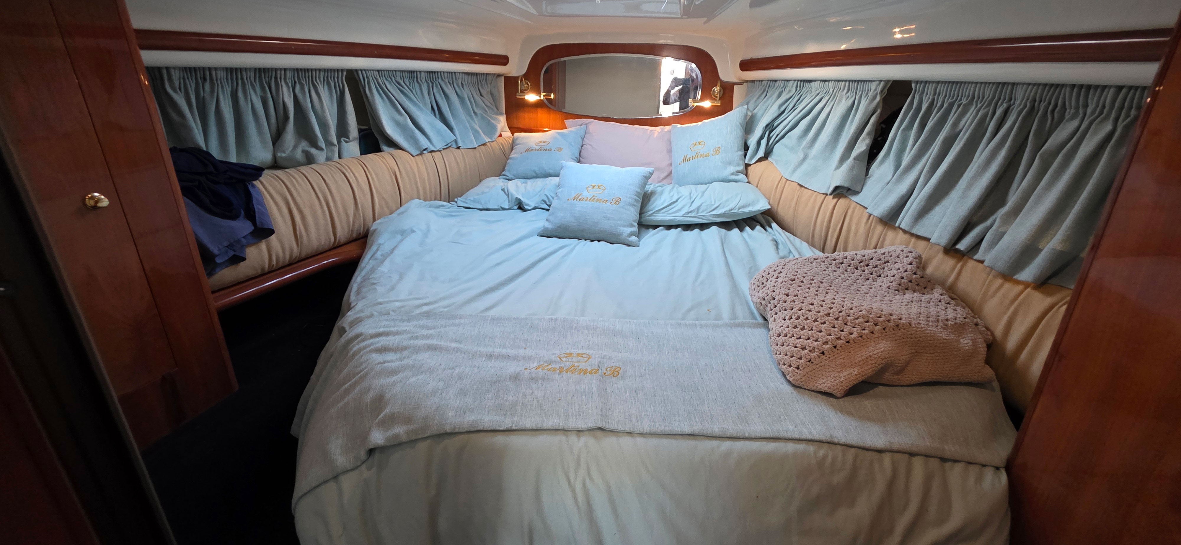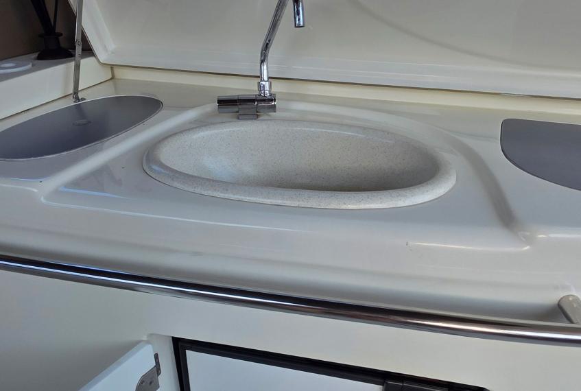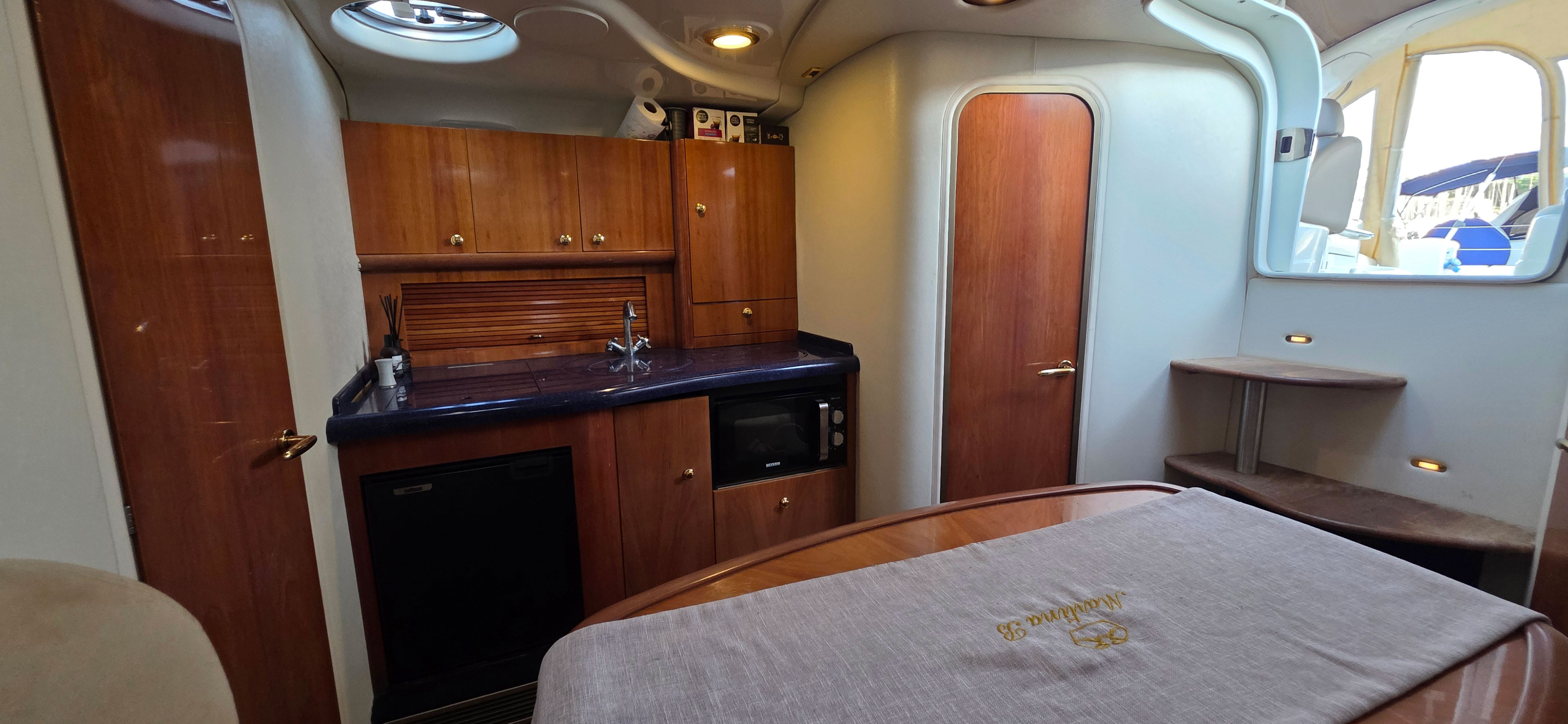 The owner’s cabin offers a peninsula double bed with ample storage, while the guest cabin includes two single berths convertible into a double. A fully equipped galley includes sink, cooktop, refrigerator, and microwave oven.