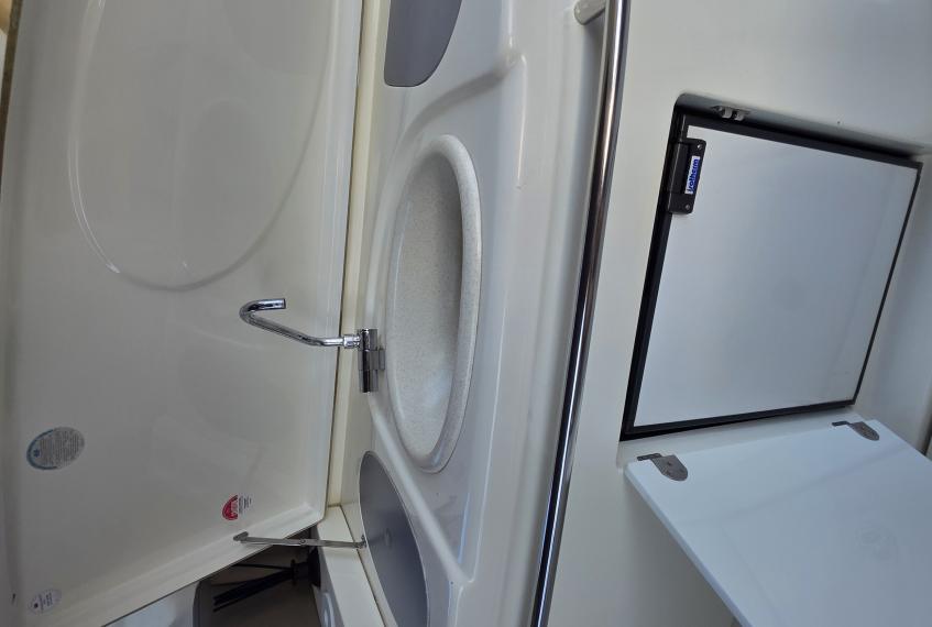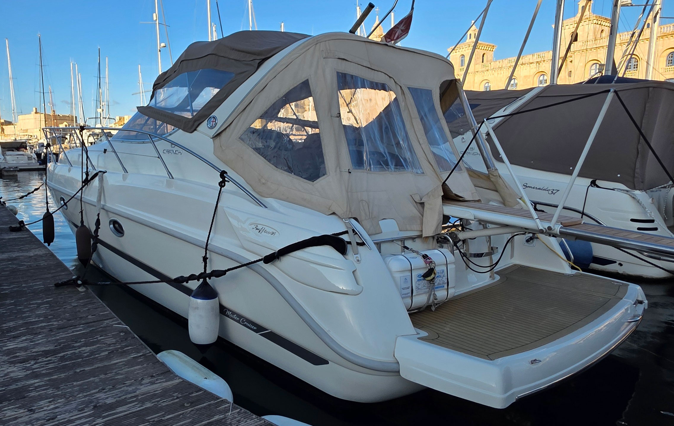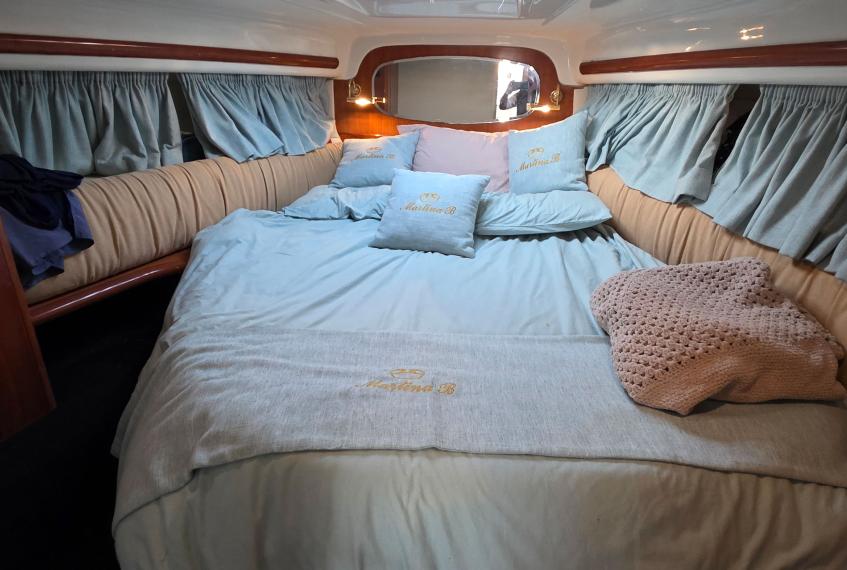 A full canvas package, including camper cover and bimini, provides excellent protection in all conditions. The foredeck offers a large sunbathing area with complete cushions, while the foldable rollbar improves versatility for low bridges or transport.