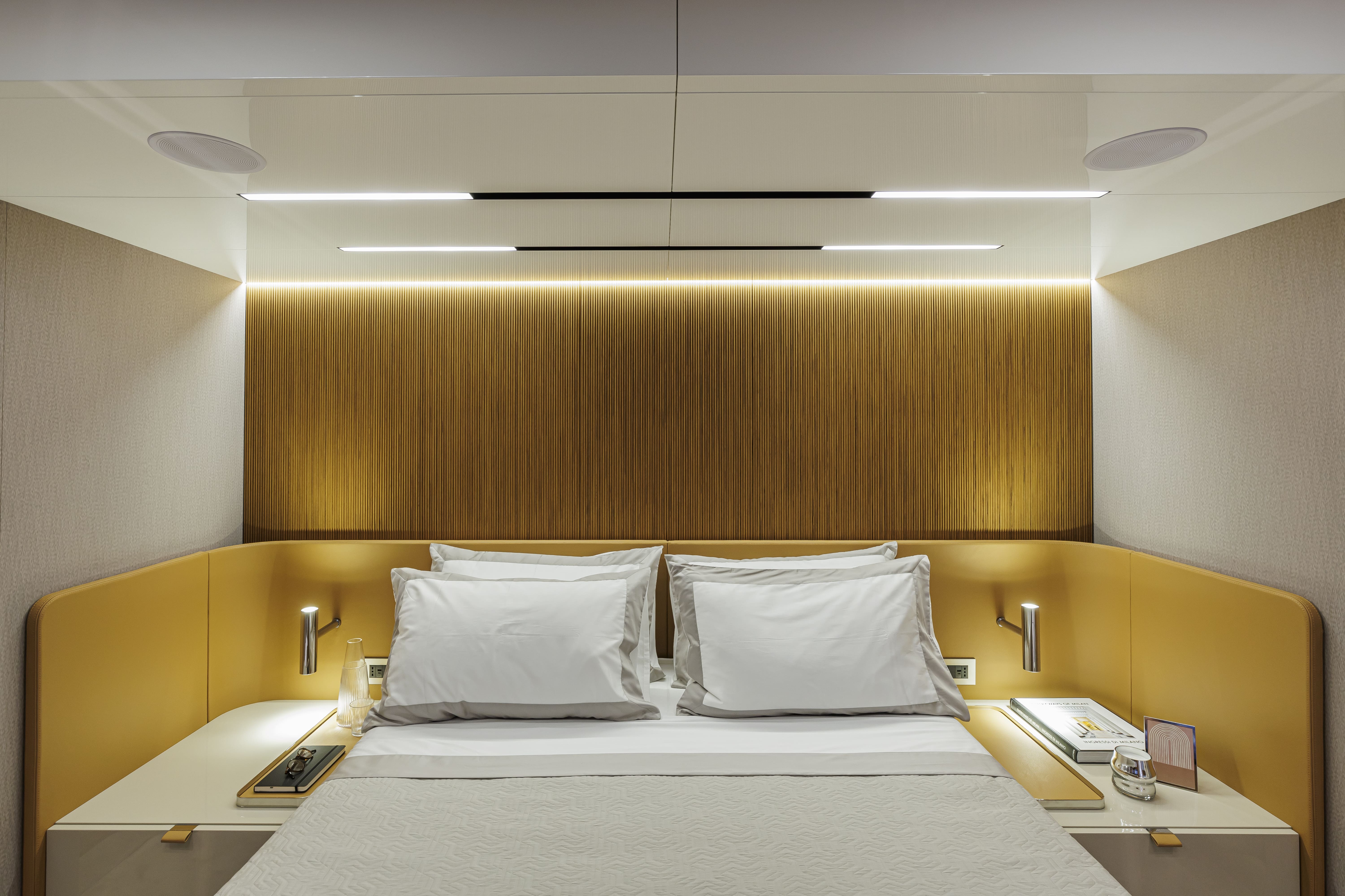 The elegance of the Sessantadue 62 encourages the choice of a precious and evocative colour such as Grigio Aurora. Fitted out with the Amalfi décor choice, the yacht offers itself as a refuge of relaxed and romantic elegance.