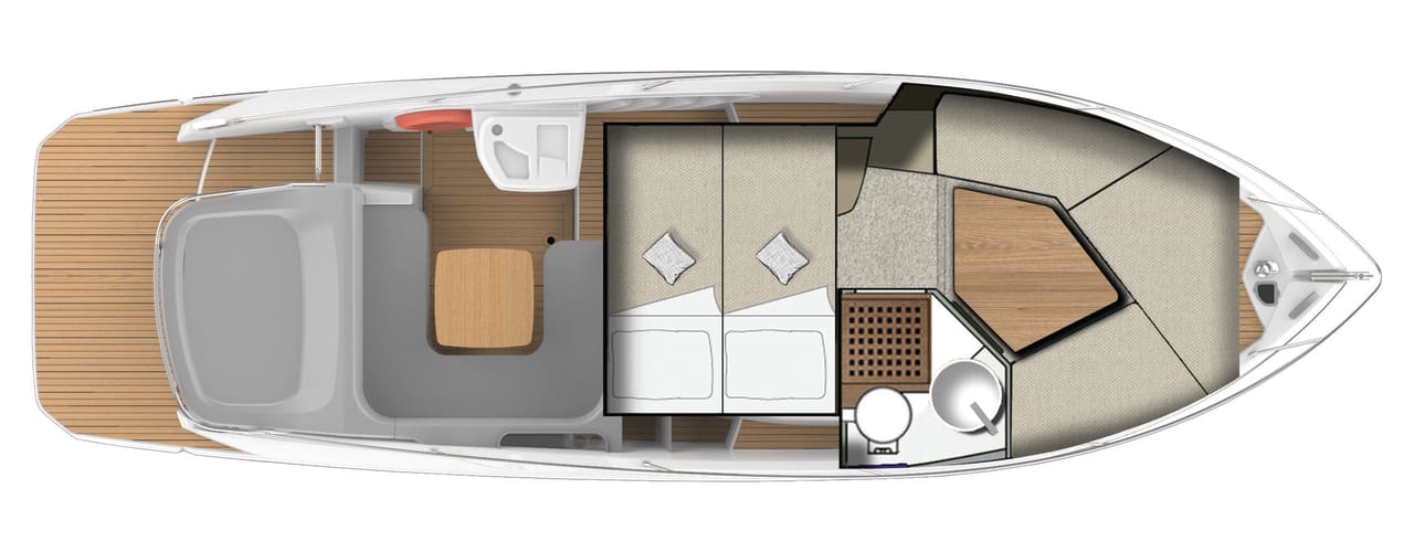 The 9.85 metre daycruiser features soft lines and refined details with a sporty, vintage style which enhance it in terms of functionality and elegance.