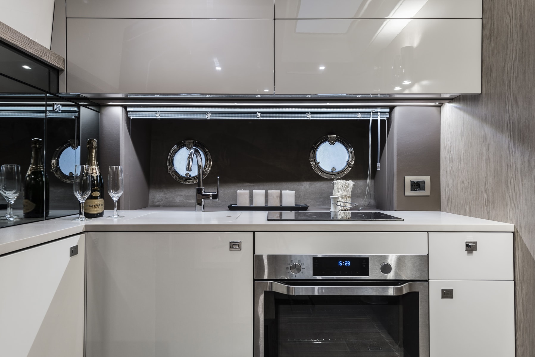The soft top provides maximum protection to the cockpit, at the same time offering a large opening which transforms the Cranchi M44 HT into an authentic open top when required. When you wish to be more sheltered, on the other hand, the excellent insulation of the roof creates a warm and closed space. The top covers the dinette which is back of the pilot station, while on the left is the galley unit and the chaise-longue which makes use of the roof opening for sunbathing.