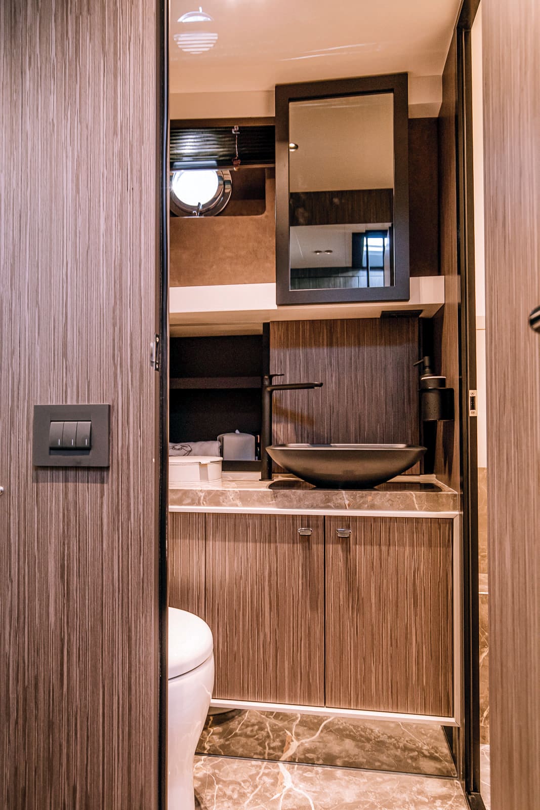 Una scelta cromatica ricercata ed energica che crea un interessante gioco di corrispondenze e contrasti con le essenze che rivestono la coperta dell'imbarcazione.