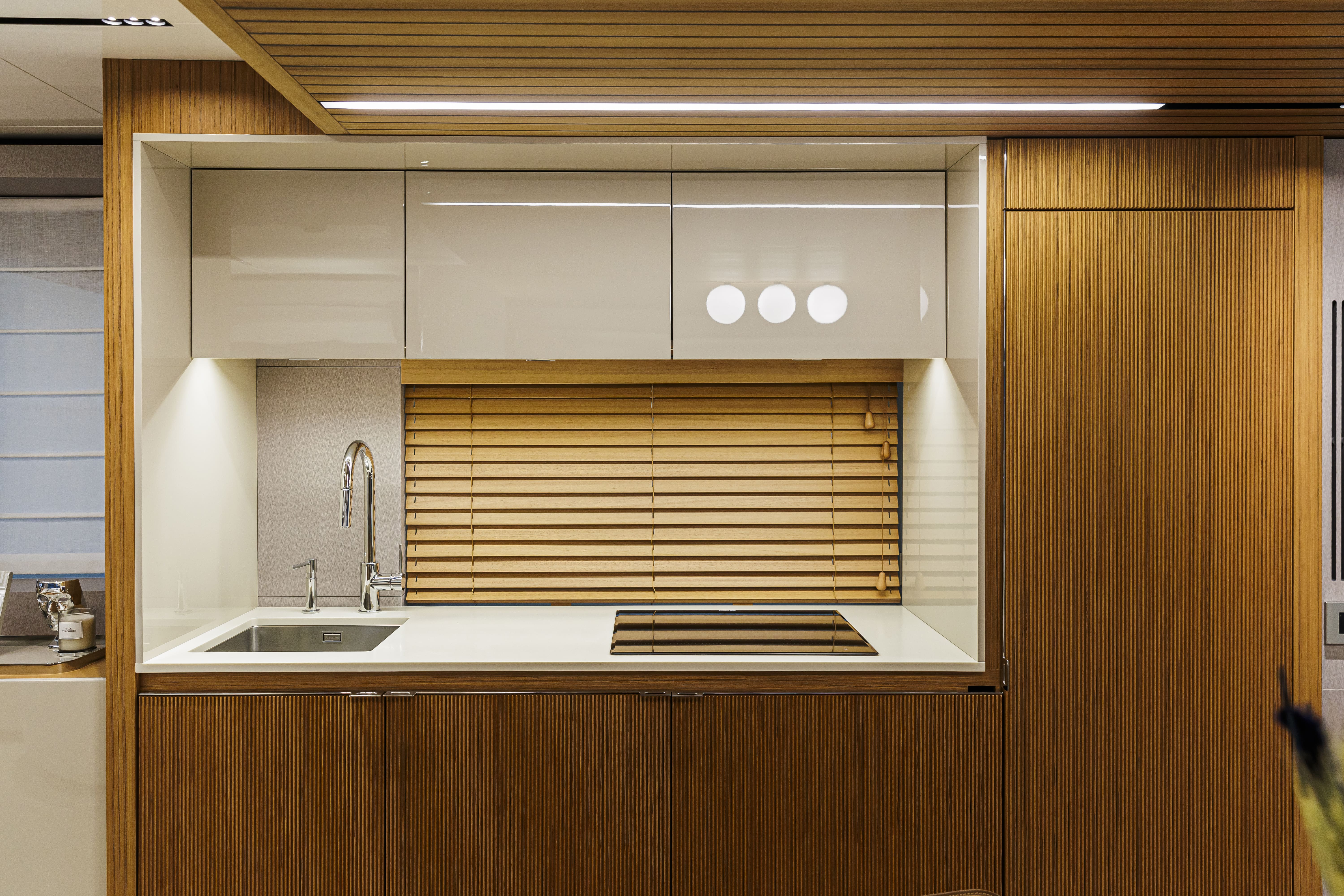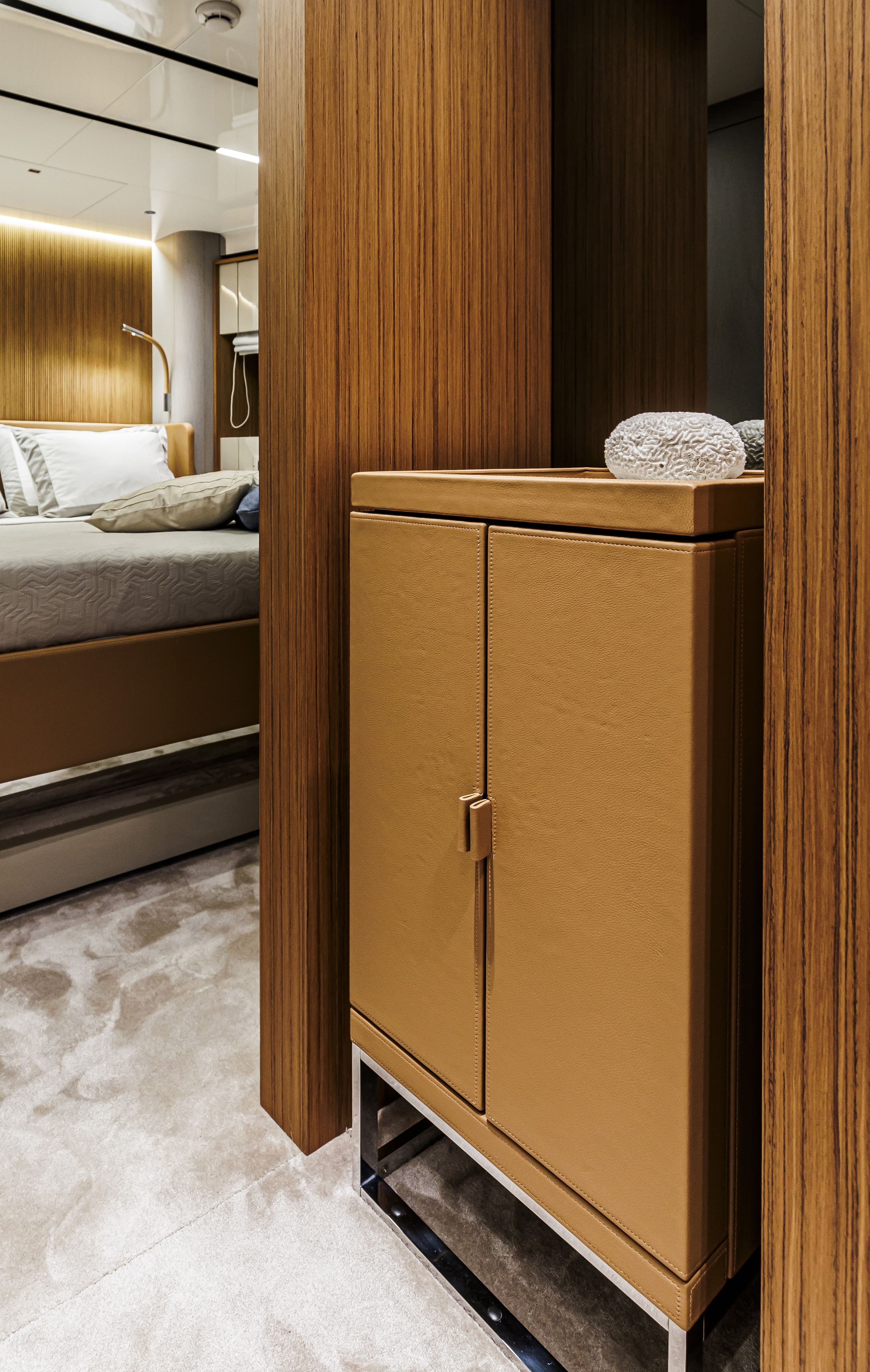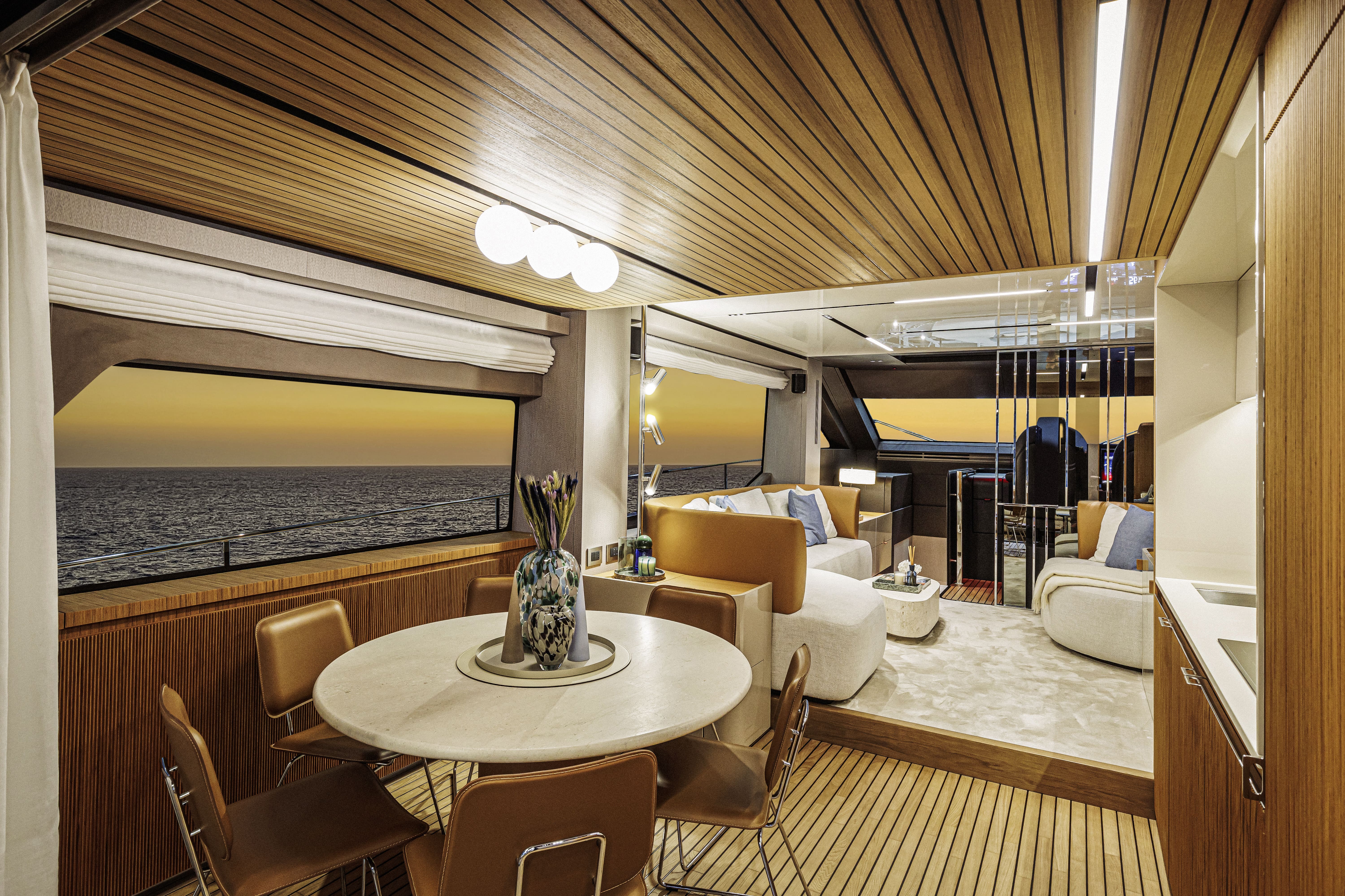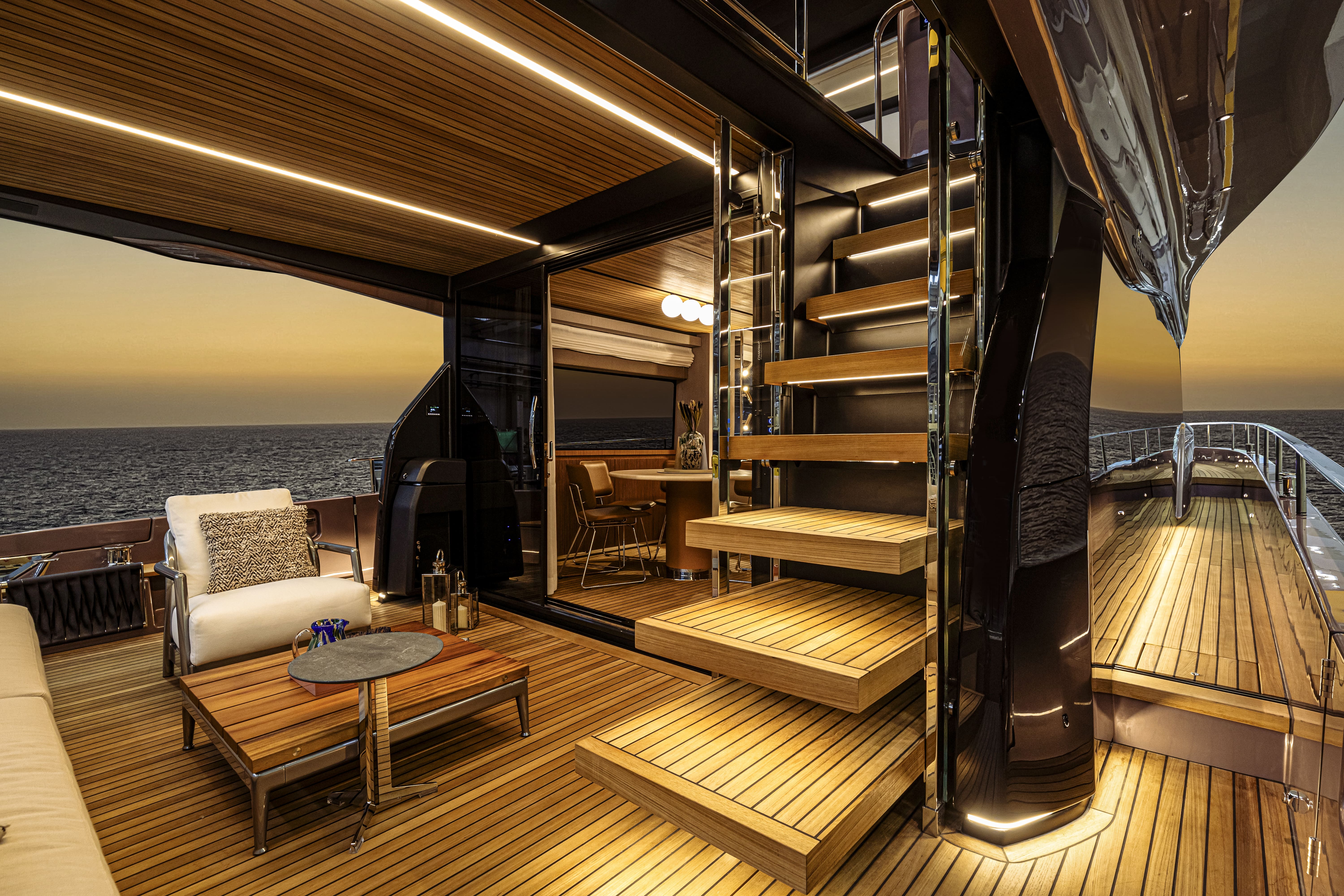 Questo classico senza tempo regala allo yacht un’aura speciale, una sfumatura calda ed avvolgente, che si presta a suggestioni di grande dinamismo, se abbinata al flybridge personalizzato in Cosmo Supremo e al t-top in nero opaco.