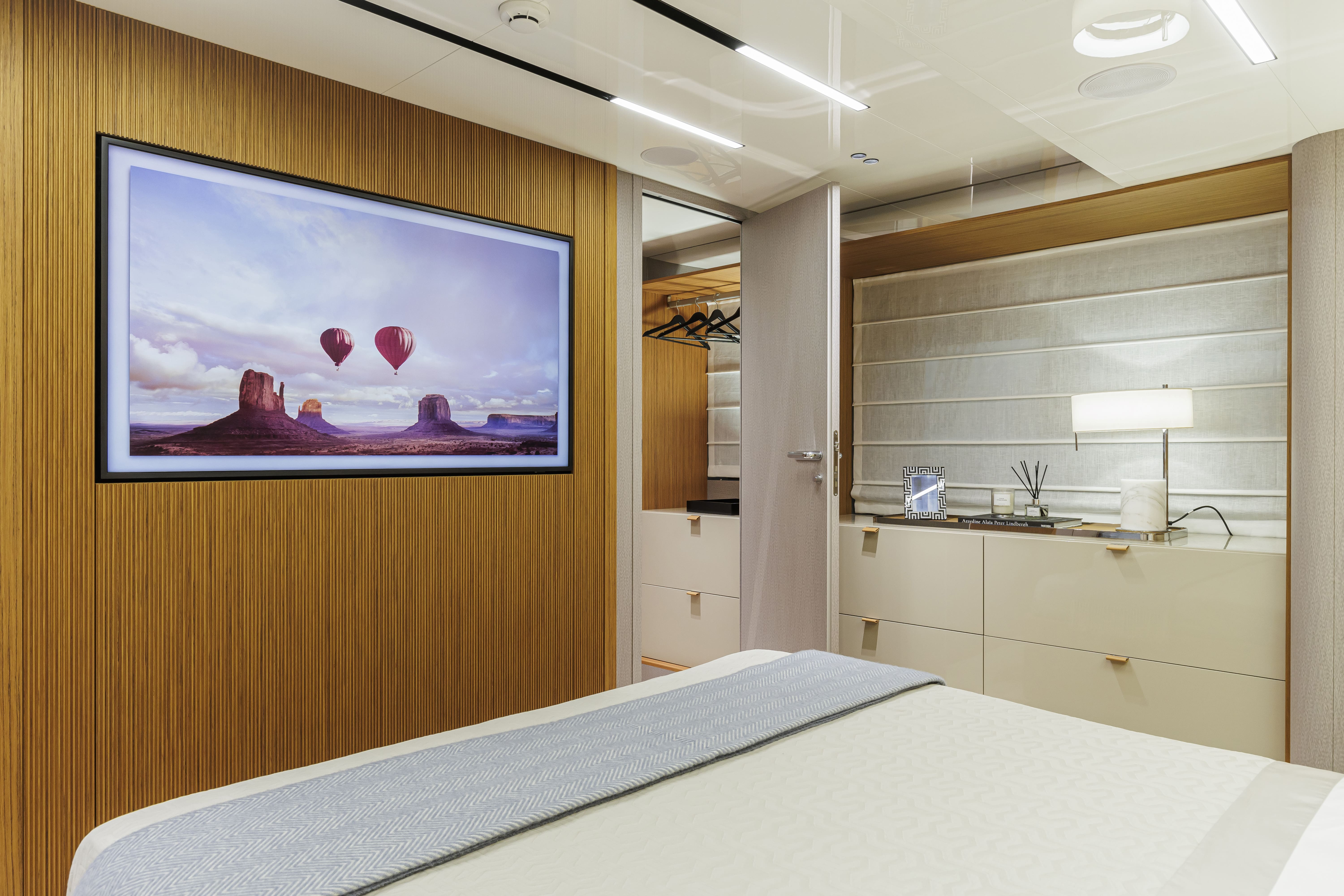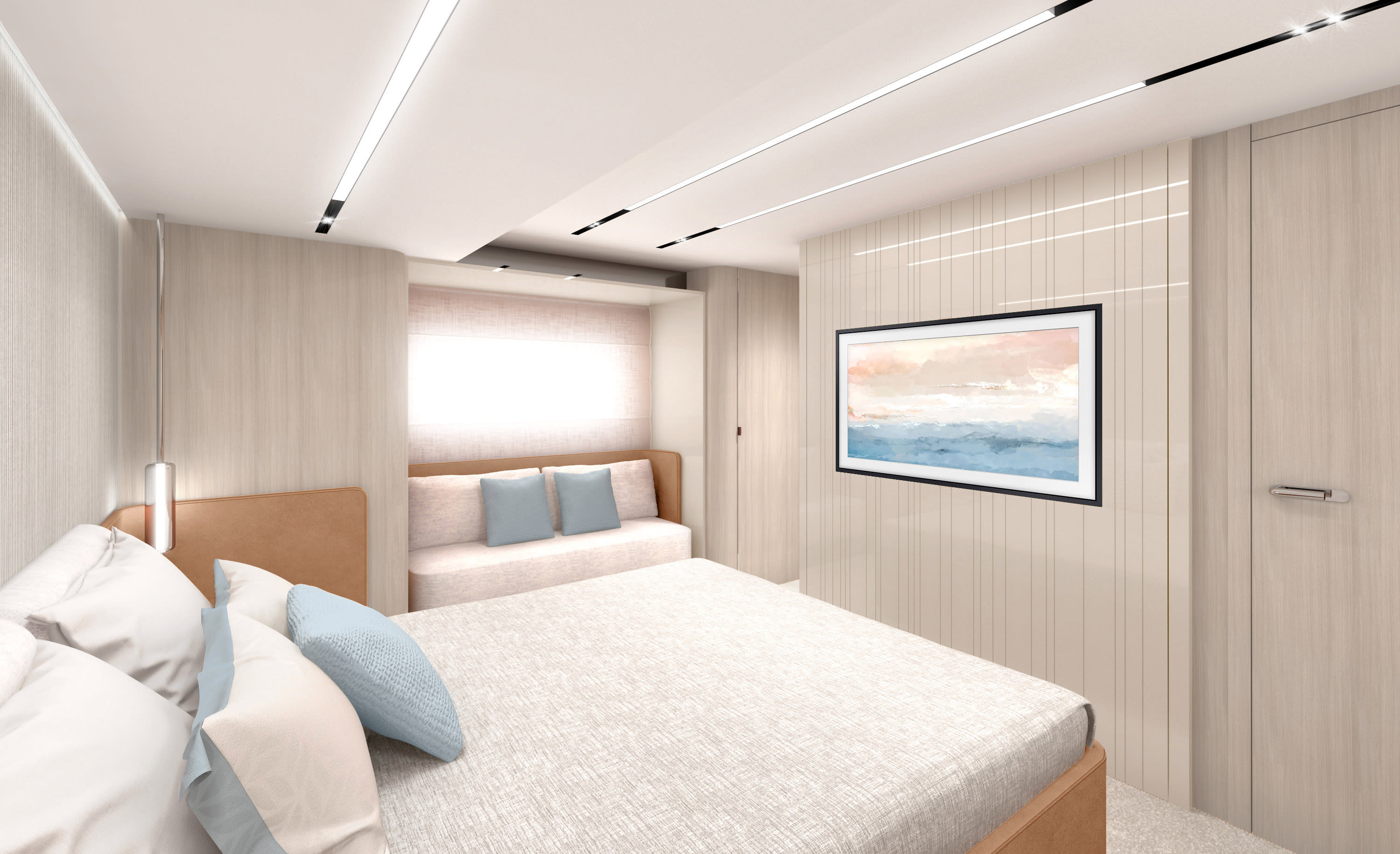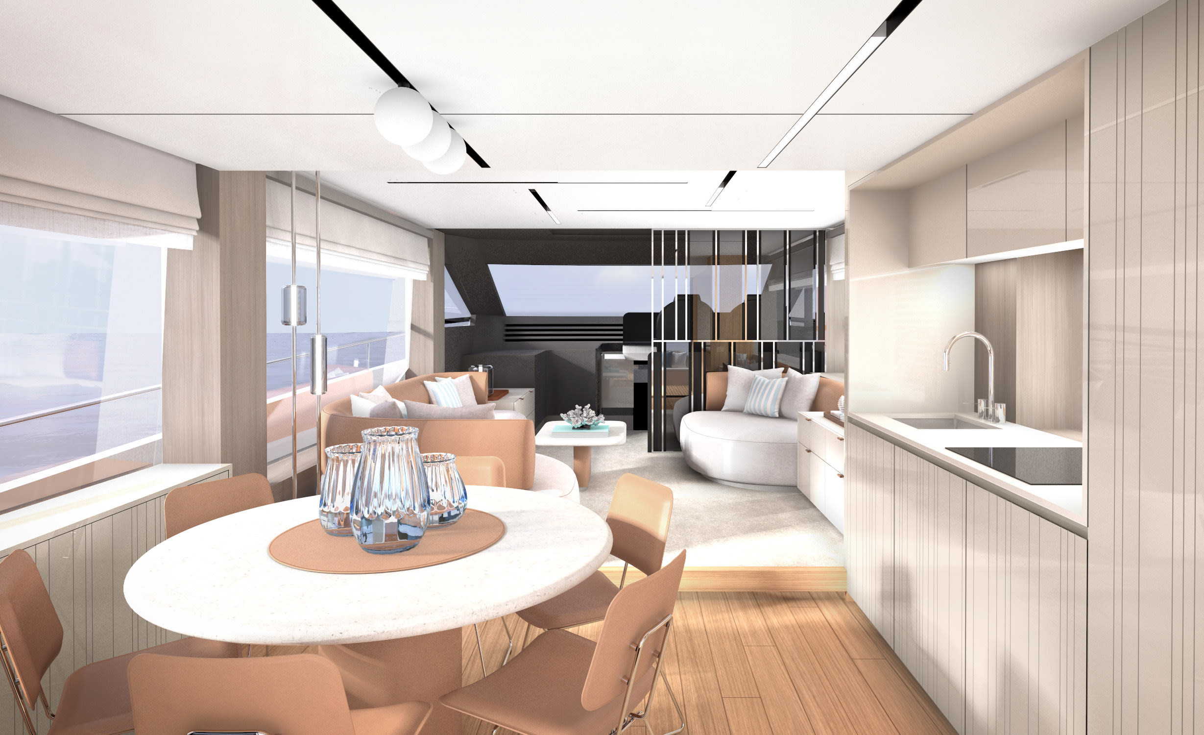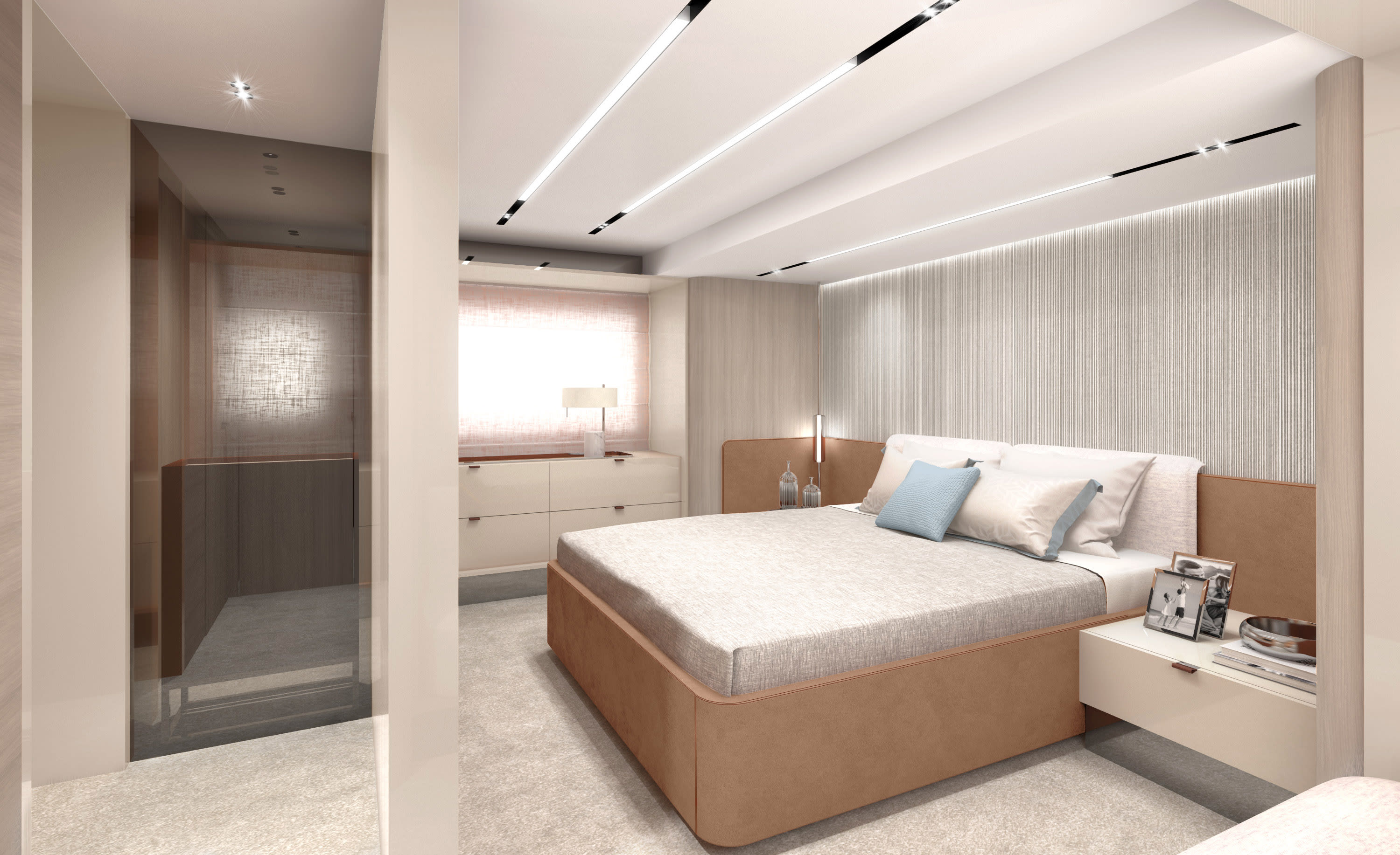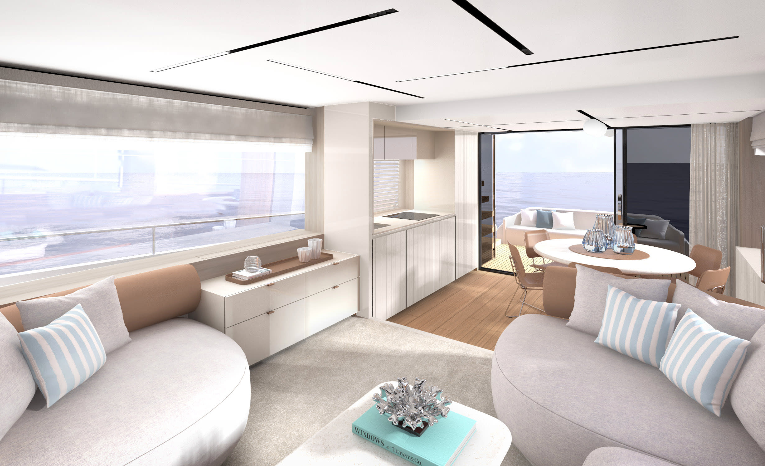 La grazia del Sessantadue 62 invita alla scelta di un colore prezioso e suggestivo come il Grigio Aurora. Allestito con il décor Amalfi, lo yacht si offre come un rifugio dall'eleganza rilassata e romantica.