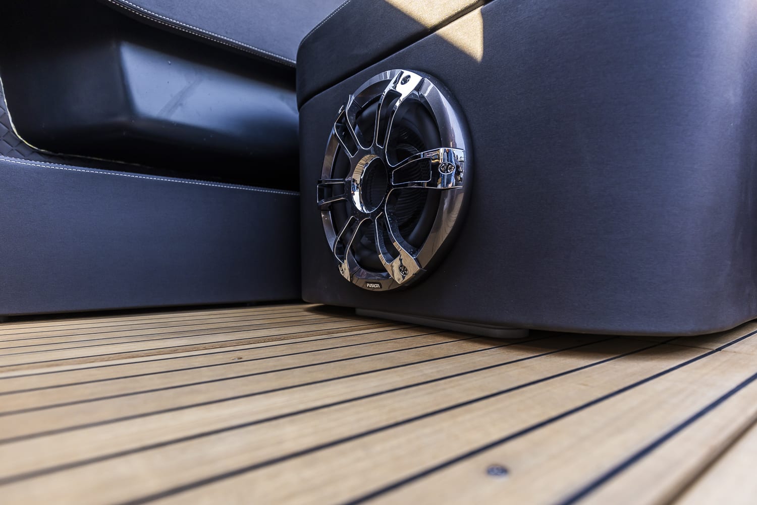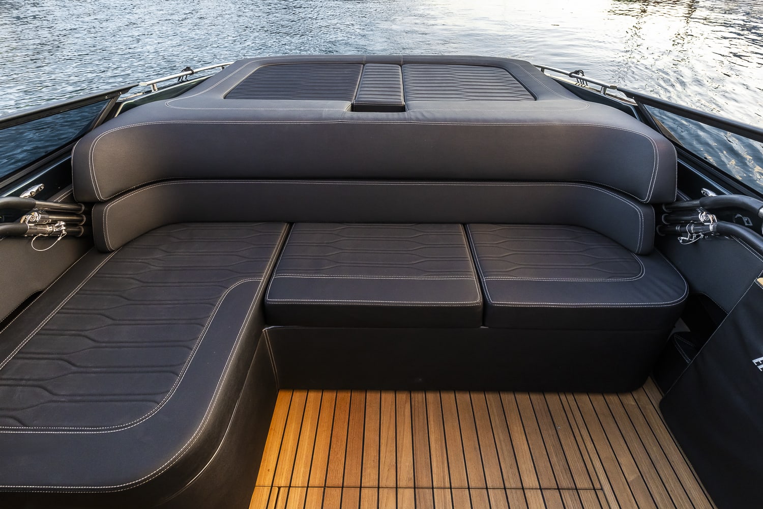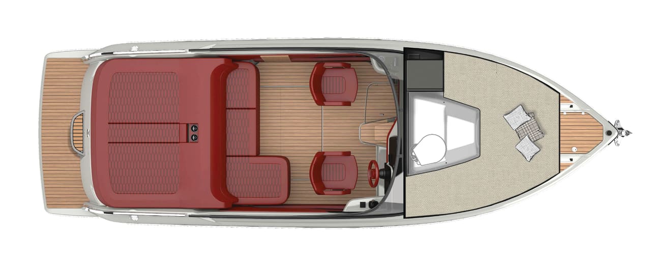 Il comfort e il benessere a bordo sono esaltati da dettagli raffinati ed eleganti e da un layout funzionale che privilegia la vita in coperta ma che comprende anche una piccola cabina e un vano toilette collocati sotto il ponte di prua, per assicurare una comoda permanenza a bordo durante l’intera giornata e, volendo, anche di notte.