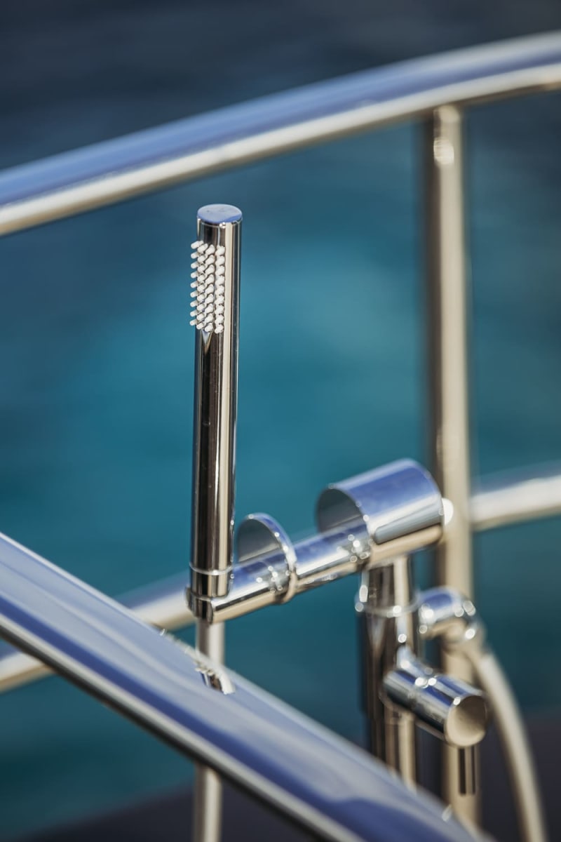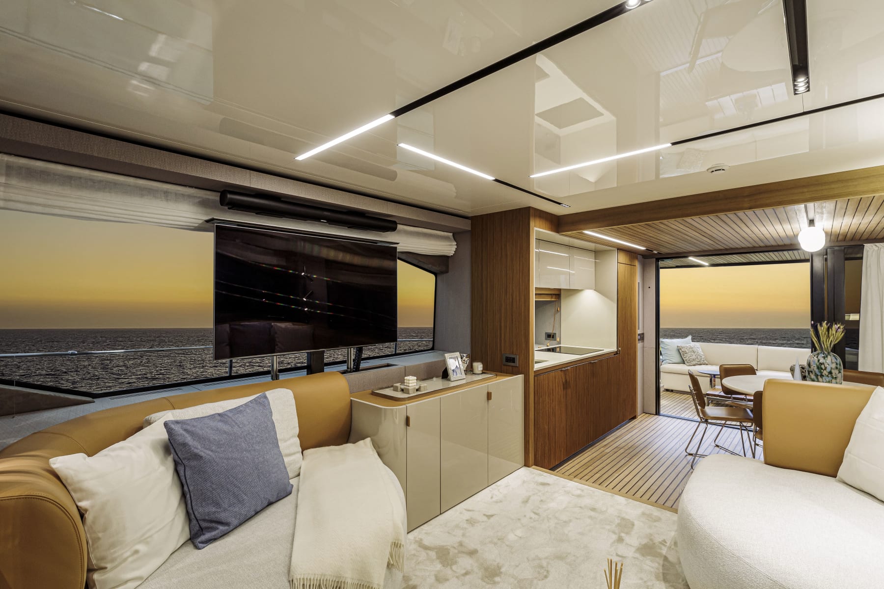 Sul Sessantadue 62 il confine tra pozzetto e salone sembra sparire: al di qua e al di là della porta a vetri, il teak riveste sia il pavimento sia il celino, regalando così l’impressione di un’unica grande veranda in cui gli spazi si fondono e si dilatano. Proseguendo negli interni del main deck e poi sottocoperta, le superfici in teak convivono magnificamente con quelle in laccato chiaro e con soluzioni di arredo e di design dell’illuminazione che trasmettono un’immediata sensazione di benessere e di rilassata eleganza. Sei sul mare, ti senti a un passo dal cielo.
