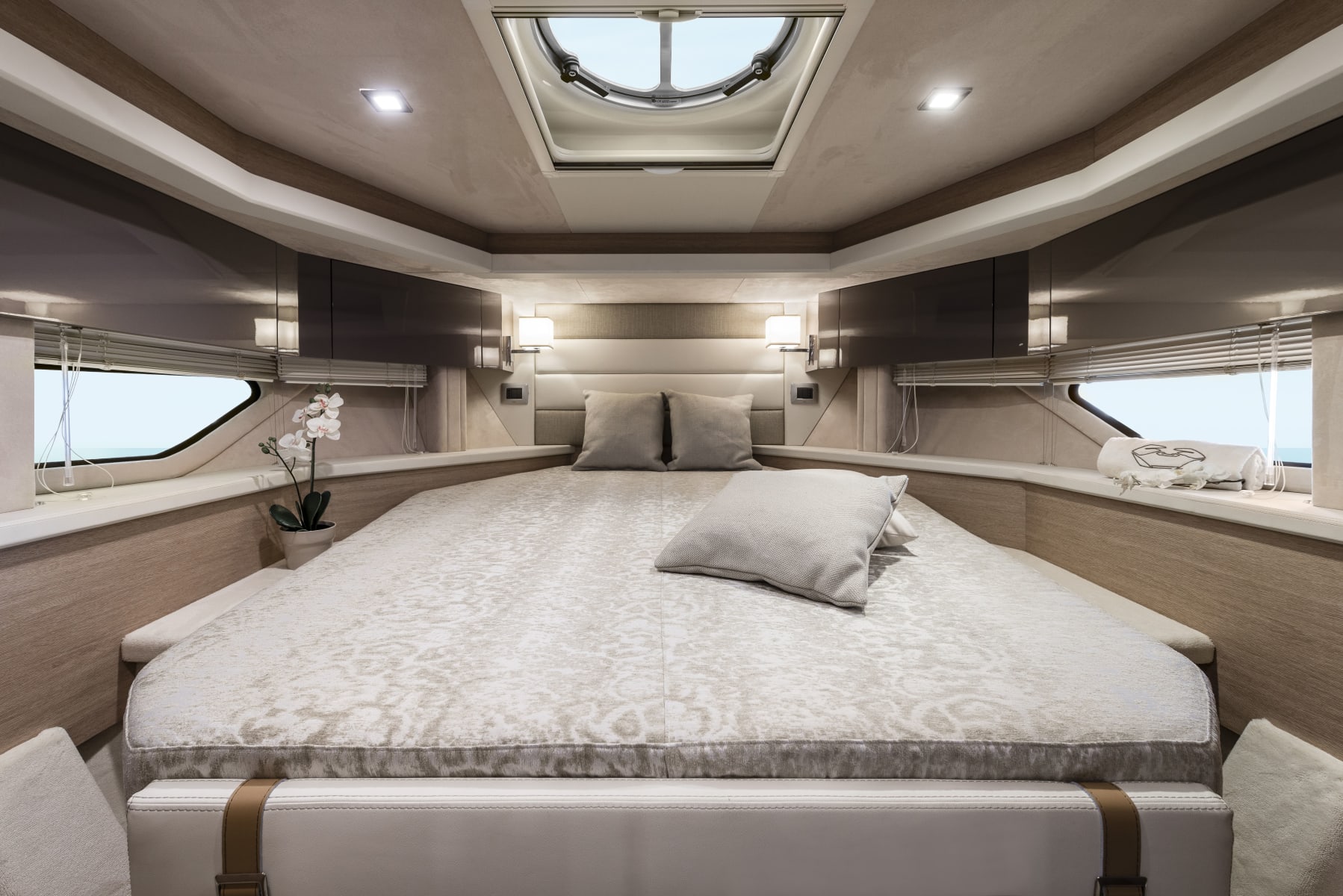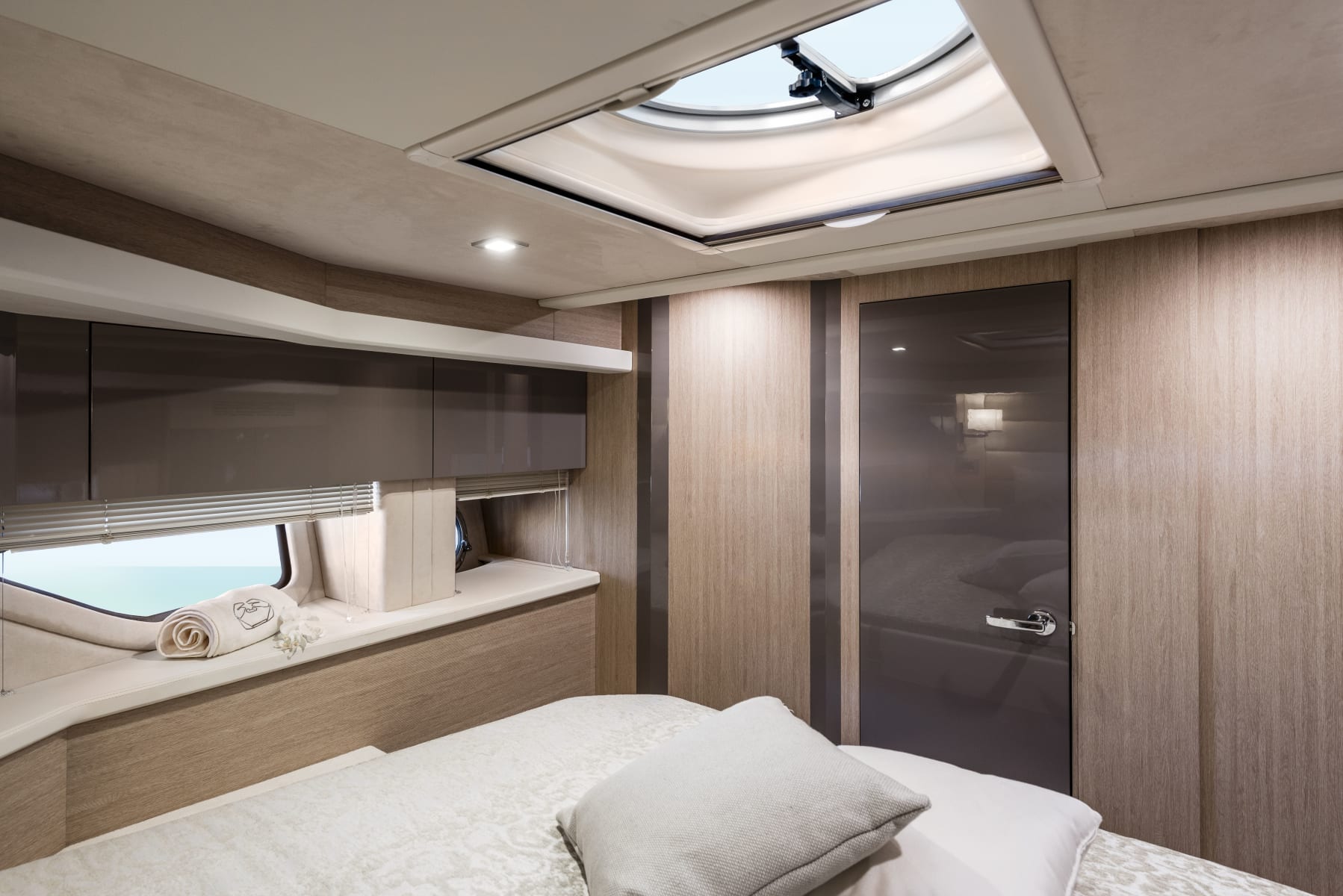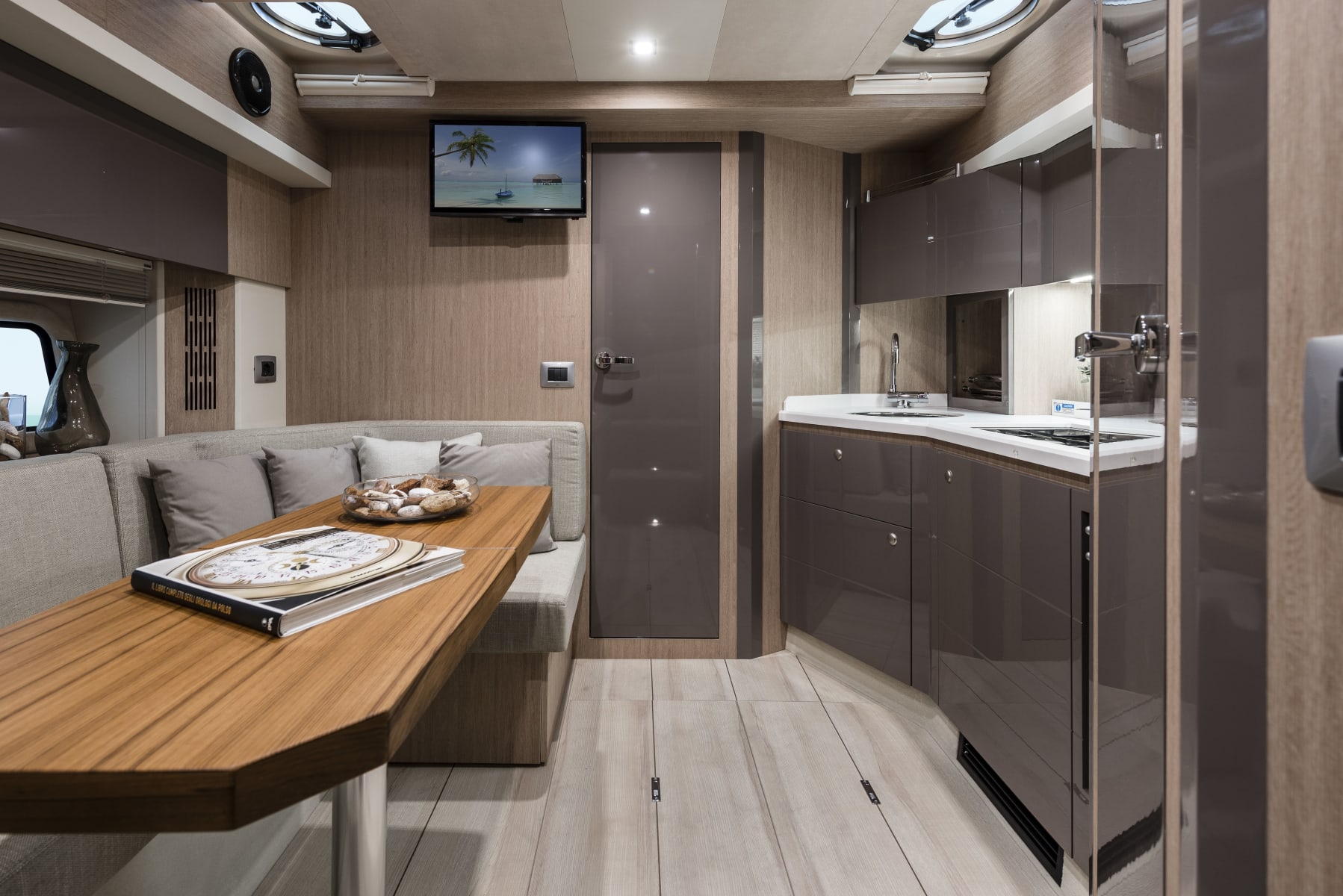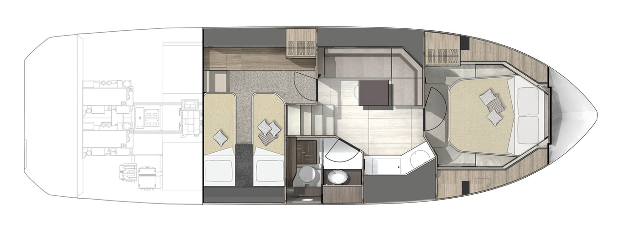 Sottocoperta, il layout si articola in due cabine, di cui l’armatoriale a prua e quella per gli ospiti a poppa, e il quadrato al centro, con la cucina e la dinette trasformabile in letto a due posti. Il bagno è completo di box doccia.
