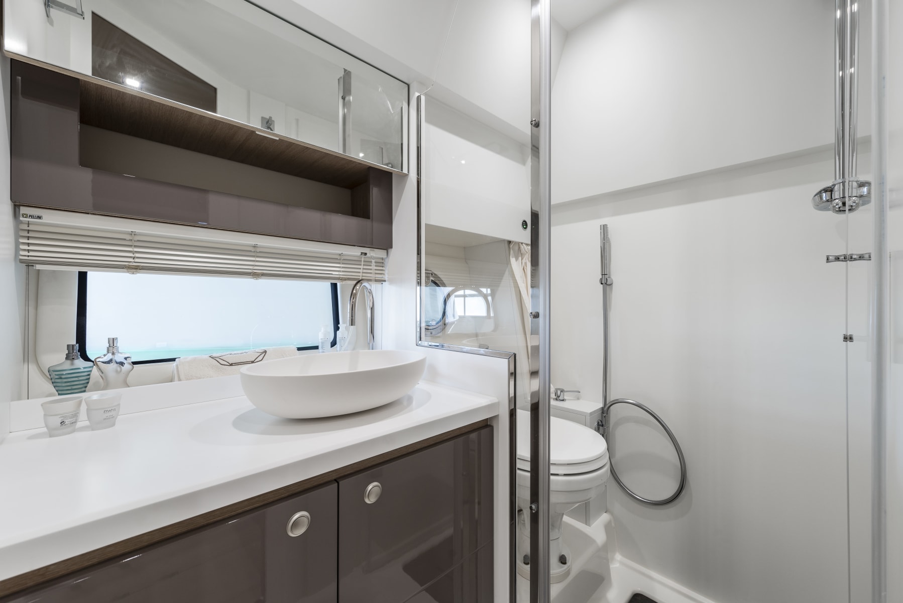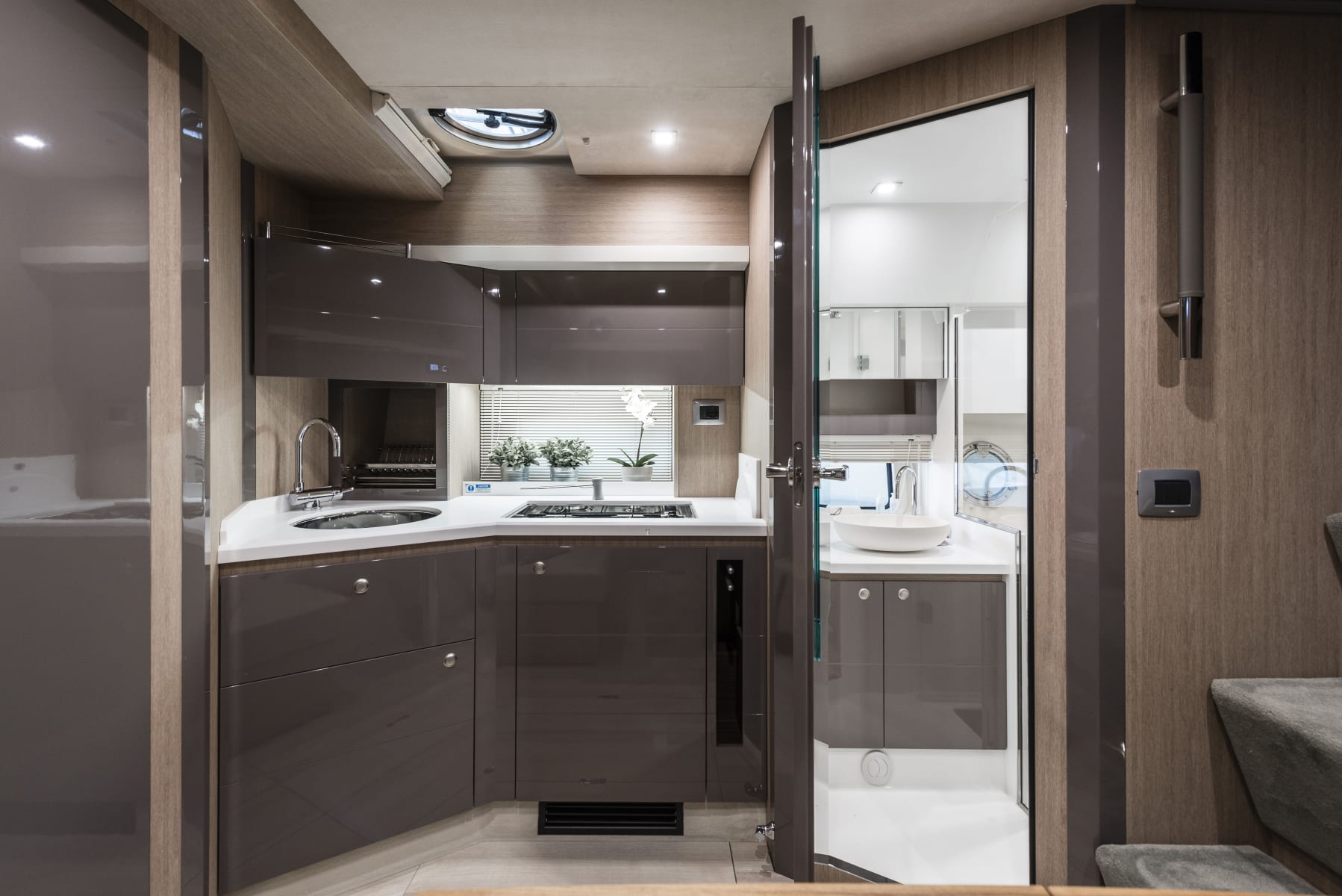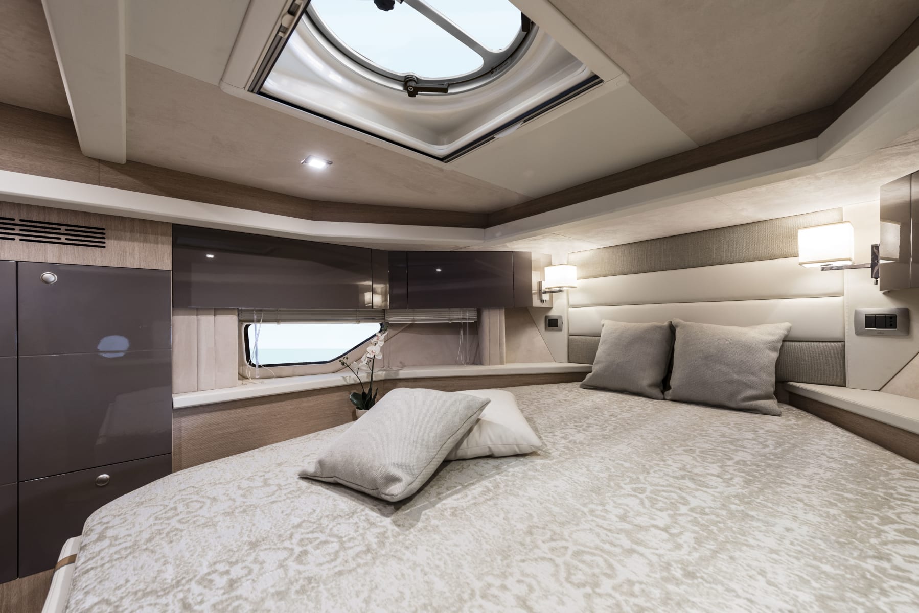 Sottocoperta, il layout si articola in due cabine, di cui l’armatoriale a prua e quella per gli ospiti a poppa, e il quadrato al centro, con la cucina e la dinette trasformabile in letto a due posti. Il bagno è completo di box doccia.