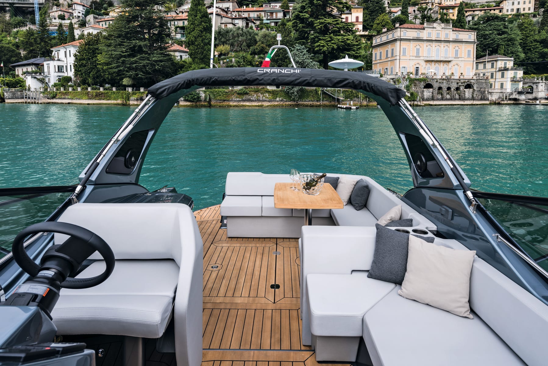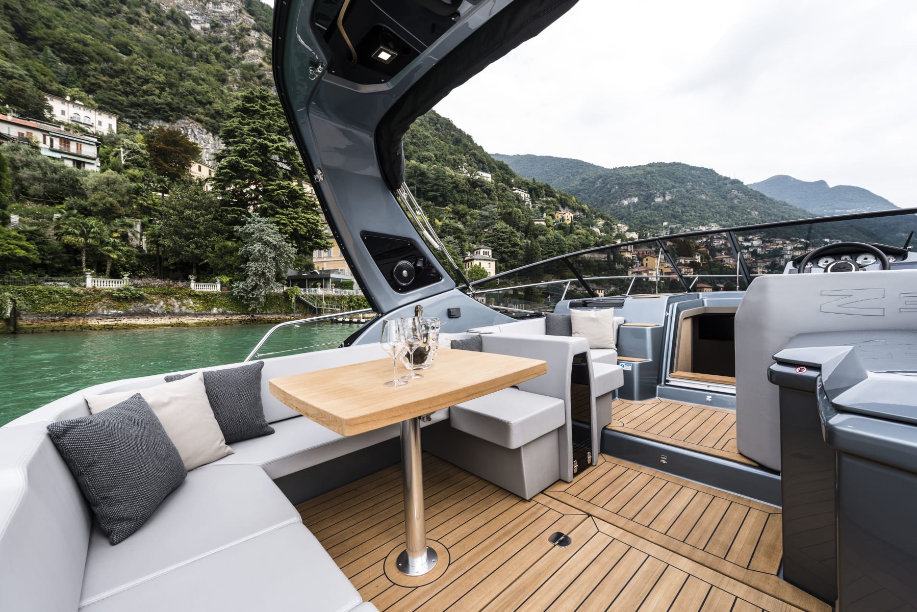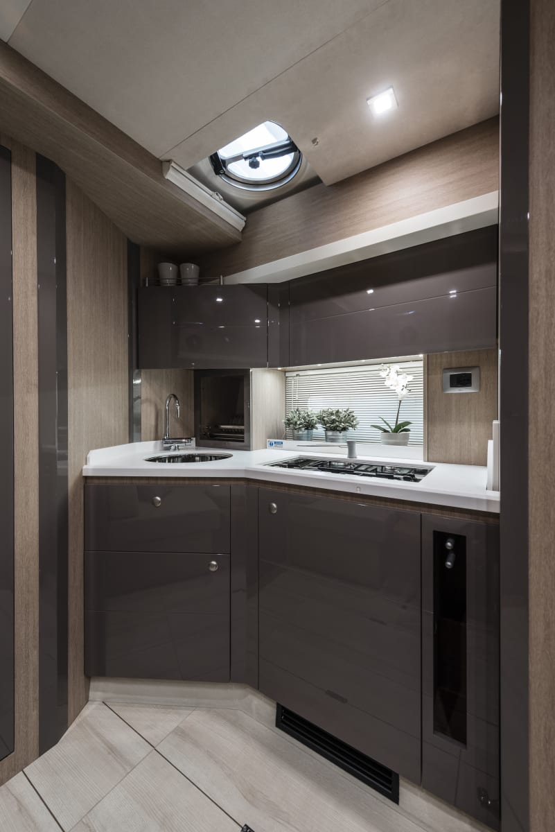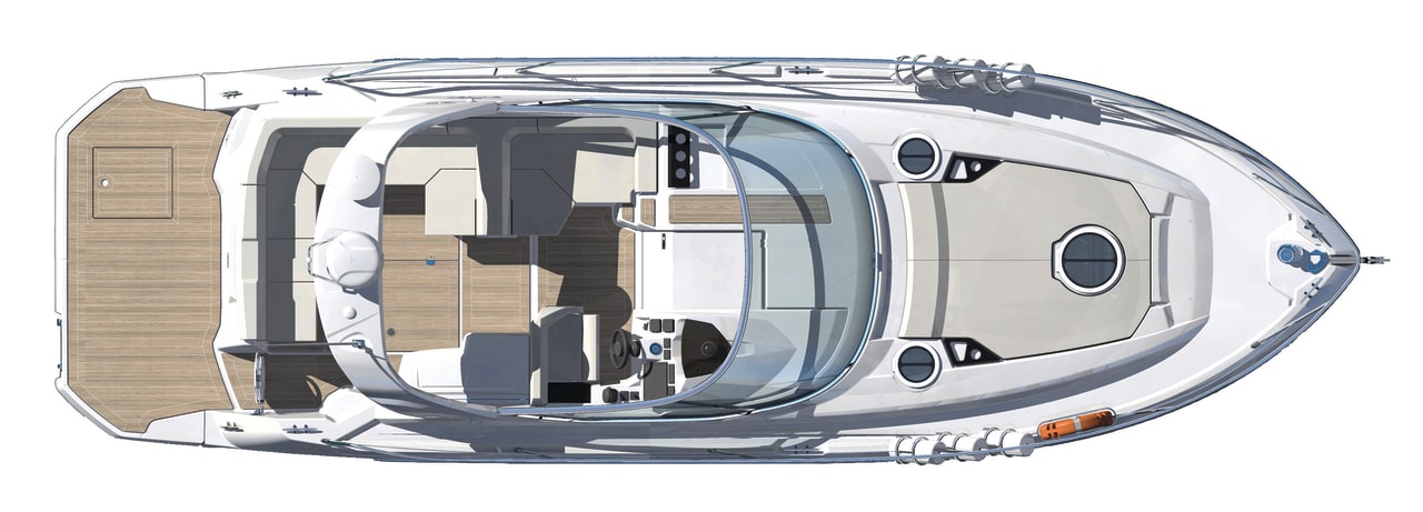 Cranchi Z35, con i suoi 11,55 metri fuoritutto e il suo pozzetto totalmente open, è il perfetto esempio di come un daycruiser dalla natura sportiva possa anche essere elegante e offrire spazio per il comfort. Il pozzetto offre un divano poppiero a C, convertibile anche in prendisole, a cui si integra un’altra seduta a L a prua. Sul lato opposto, quello di dritta, c’è invece la cucina e la postazione di guida, che dispone di un piano ampio per ospitare la strumentazione elettronica.
